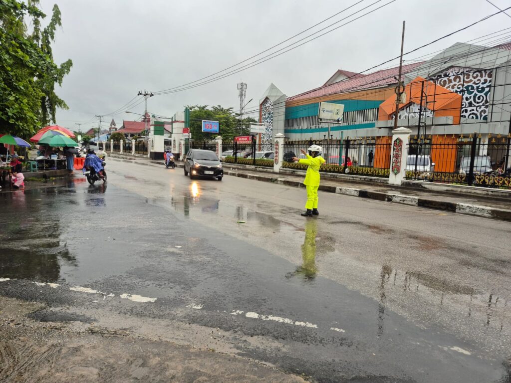 Palangka Raya – Personel Satuan Lalu Lintas (Satlantas) Polresta Palangka Raya tetap melaksanakan kegiatan pengaturan lalu lintas pagi (gatur pagi) di sejumlah titik rawan kepadatan arus kendaraan, Selasa (10/2/2026). Kegiatan tersebut berlangsung mulai pukul 06.00 hingga 07.15 WIB, meski diguyur hujan sejak pagi hari.
