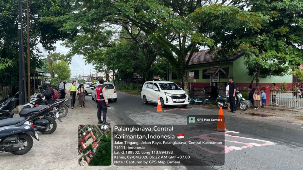 Palangka Raya – Personel Patmor 10.4.2 Sat Samapta Polresta Palangka Raya melaksanakan kegiatan pengaturan arus lalu lintas di depan SDN 1 Bukit Tunggal, Jalan Tingang, Kamis (2/4/2026).