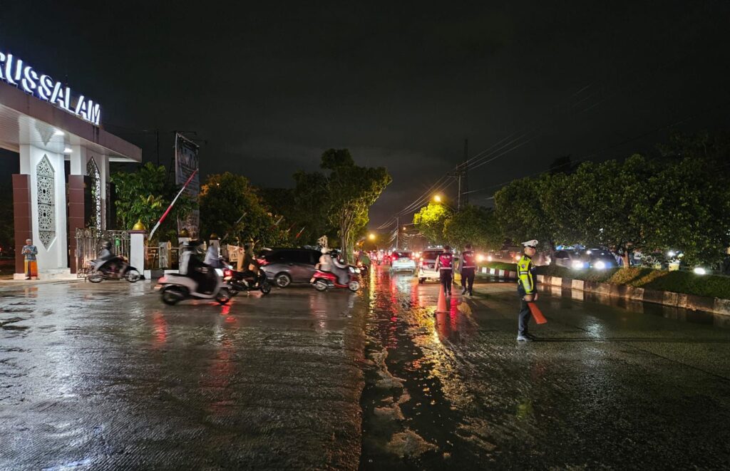 Selain melakukan penjagaan di area masjid, personel juga melaksanakan pengaturan arus lalu lintas di sepanjang Jalan G. Obos guna menjaga kelancaran kendaraan jamaah maupun pengguna jalan lainnya sehingga tercipta situasi kamseltibcarlantas yang tertib dan aman.