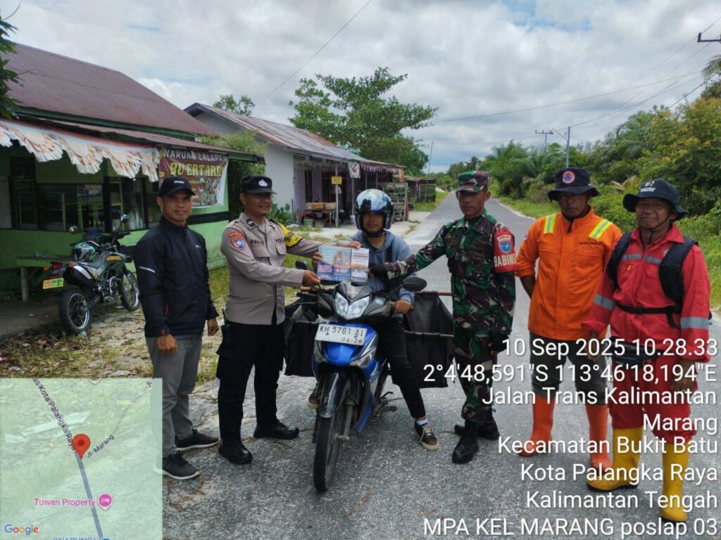 Rabu (10/9/2025), personel Polsek Bukit Batu bersama Tim Serbu Api Kelurahan (TSAK) dan Masyarakat Peduli Api (MPA) melaksanakan patroli pencegahan di wilayah Kelurahan Marang, Kecamatan Bukit Batu, Kota Palangka Raya.