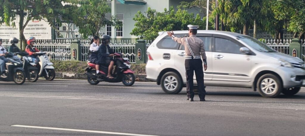 Palangka Raya – Personel Polsek Pahandut Polresta Palangka Raya melaksanakan kegiatan pengaturan arus lalu lintas pada pagi hari di Jalan A Yani, tepatnya di depan Mako Polsek Pahandut.