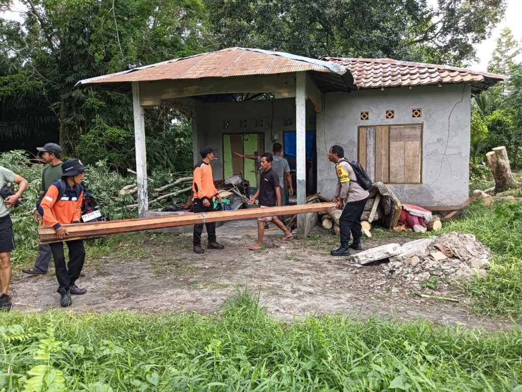Mereka bersama-sama bergotong royong memperbaiki rumah milik warga bernama Salpua yang rusak akibat tertimpa pohon.