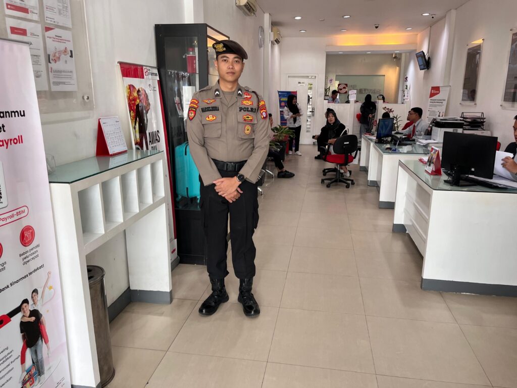 Personel Satpamobvit melaksanakan patroli dialogis dan pemantauan situasi secara langsung, baik di area layanan nasabah maupun lingkungan sekitar kantor bank, untuk memastikan situasi tetap aman dan kondusif.